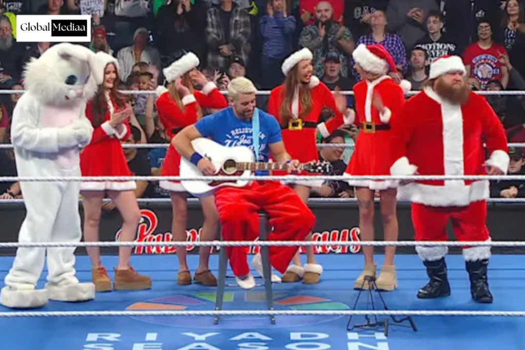 Joe Hendry begins the segment with a song, surrounded by Otis, Akira Tozawa, and several figures in Santa get-up (with a surprise appearance from the Easter Rabbit). The Miz makes his appearance, and he is irate as Grand Rapids joins Hendry in a tiny balls parody of “Jingle Bells.”