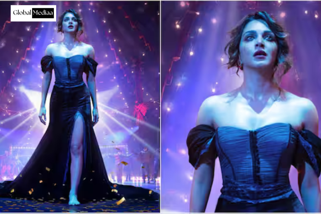 The poster features Kiara in an off-shoulder gown with a thigh-high slit. The actress appears to be walking forward while gazing up in a perplexed manner. Kohl-tinged tears streak Kiara’s face in the visual.